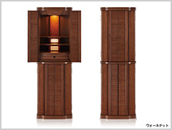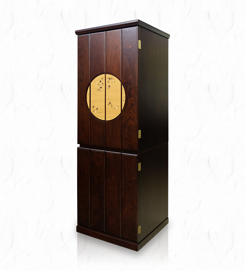 紫壇系バーロッサ材で落ち着きのある重厚感を残しながら、高さ150cm、横幅52cmというスタイリッシュなシルエットに仕上げたモダン仏壇で、和室、洋室どちらでも場所を選ばず設置していただけます。