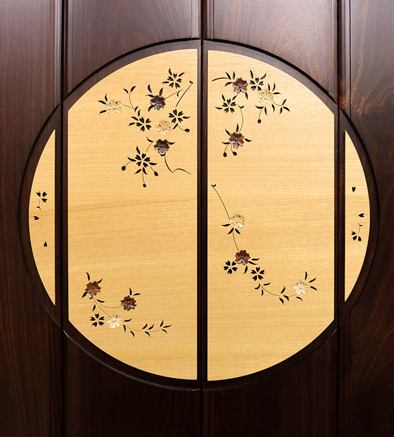 無垢のけやき材や紫檀材で花弁を象嵌した円窓は、精巧な職人技法で作られています。